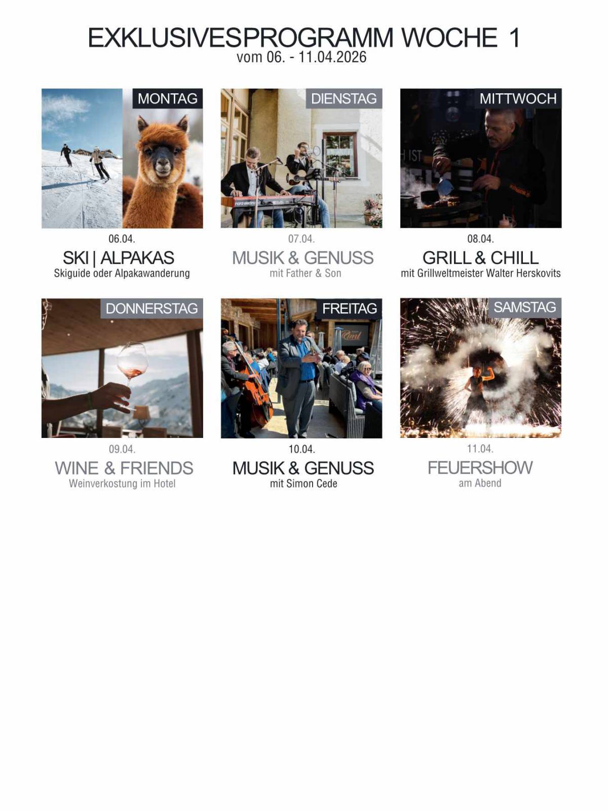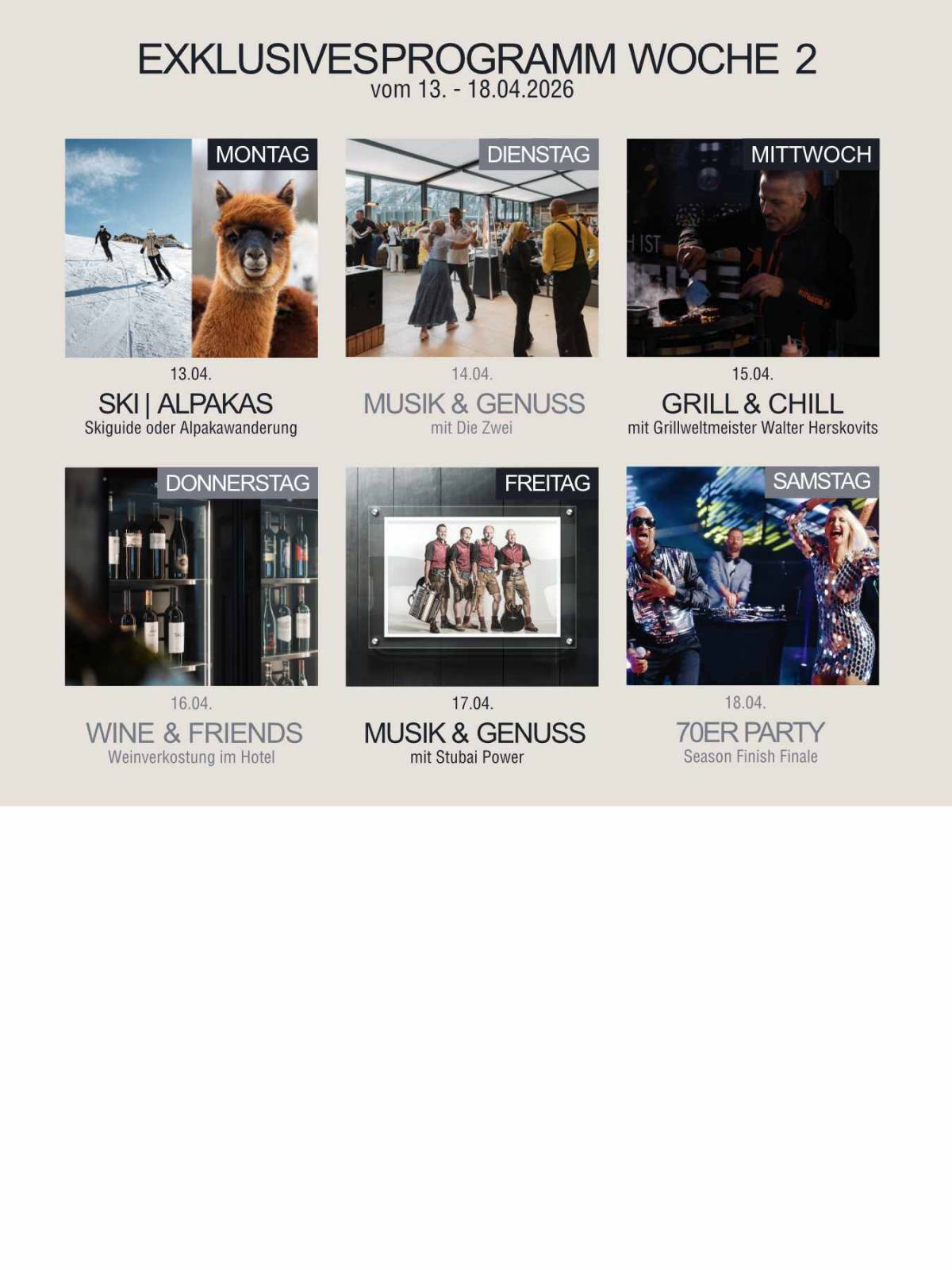 - Wir freuen uns, Sie zur diesjährigen Stammgäste & Friends Woche einzuladen! Vom 06. April bis zum 19. April 2026 erwartet Sie ein abwechslungsreiches Programm, das den Abschluss unserer Saison gebührend ausklingen zu lassen.